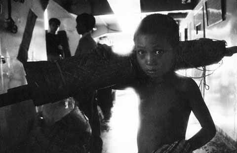 Seven-year-old migrant Liu Wei carried a sleeping mat as he moved from Xiangjia village in Zigui county, Hubei province by ship on June 25, 1995. The village was among the first batch to be relocated for the dam. All of the 184 residents from the village moved to a suburb of Yichang city in the same province. [Photo by Li Feng/chinanews.com]
