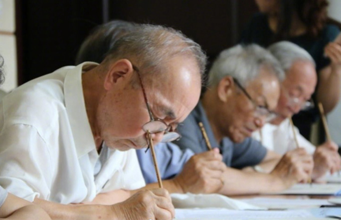 Villagers and visitors watch a local photo exhibition at the Dong village of Xiaoguang in Qiandongnan Miao And Dong autonomous prefecture, Southwest China's Guizhou province, July 13, 2017. More than 50 photos, which showed local customs and the new life of villagers at the Dong village of Xiaoguang, were exhibited here from July 12 to 14. [Photo/Xinhua] |