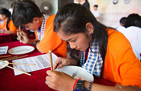 A painting featuring young Lin Fengmian (right) and his teacher was showcased at the exhibition, Baotou, Inner Mongolia, July 8, 2017. [Photo/namoc.org] |