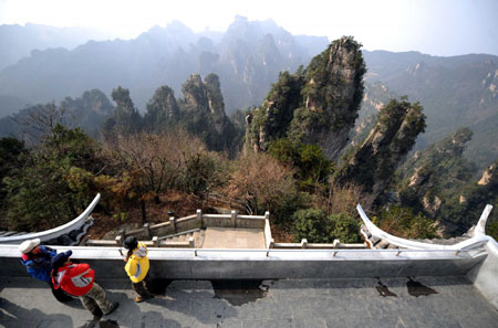2月10日,游客在張家界黃石寨景區(qū)游覽。 湖南省張家界市近日出臺(tái)旅游業(yè)刺激政策,內(nèi)容包括包機(jī)旅游政府獎(jiǎng)勵(lì)、大批A級(jí)景區(qū)門(mén)票7折、暫退1700萬(wàn)元旅行社保證金、減免導(dǎo)游服務(wù)費(fèi)等,以幫助當(dāng)?shù)芈糜螛I(yè)在國(guó)際金融危機(jī)中逆勢(shì)發(fā)展。 新華社記者 趙眾志 攝