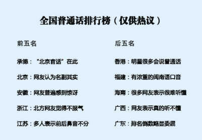 近日,一份普通話排行榜在網(wǎng)上引起一片熱議。根據(jù)排行榜:河北承德市、遼寧阜新市和朝陽市、內(nèi)蒙古赤峰市位居榜首,北京話屈居亞軍。廣東話“慘不忍聽”,排名最后。此榜一出,眾多網(wǎng)友關(guān)于“普通話排行榜科學(xué)嗎?”,“哪個地區(qū)的普通話更標準?”的討論在網(wǎng)上此起彼伏。由此引發(fā)的連鎖熱門話題——“漢語方言會消失嗎?”也成為了爭議的焦點。針對這3個問題,網(wǎng)民們“南腔北調(diào)”各執(zhí)一詞,大打口水戰(zhàn)。