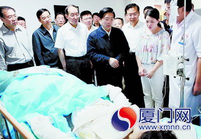 7日廈門公交車起火案件發(fā)生后,我市積極救治受傷人員。國務(wù)委員、公安部部長郭聲琨,省委書記尤權(quán)、省長蘇樹林,省委常委、廈門市委書記王蒙徽,市長劉可清前往受傷人員集中收治的醫(yī)院,看望慰問傷員。