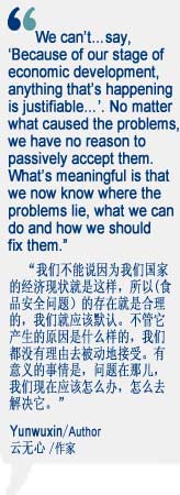 Yunwuxin: I think the opinion has its grounding, but we can't use that as an excuse and say, 'Because of our stage of economic development, anything that's happening is justifiable, and we should accept it'. No matter what caused the problems, we have no reason to passively accept them. What's meaningful is that we know where the problems lie and what we can do and how we should fix them.