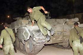 An Israeli soldier jumps from a tank during preparation for a withdrawal of Israeli troops from the West Bank town of Qalqilyah on November 4. Washington has been pushing Israel to pull out troops from reoccupied areas as it tries to calm tensions and bolster Arab and Muslim support for its campaign in Afghanistan following the September 11 attacks on the United States. [Reuters]