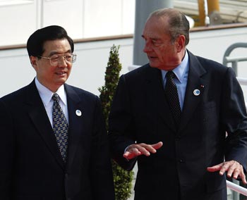 | | Chinese President Hu Jintao (L)speaks with French President Jacques Chirac (R) after arriving in Evian, France for an informal South-North dialogue meeting between the heads of of 11 developing countries and leaders from the Group of Eight , June 1, 2003. France is hosting the annual G8 summit, June 1-3, 2003 which on the first day is expanded to include leaders of major developing countries. [Reuters] |