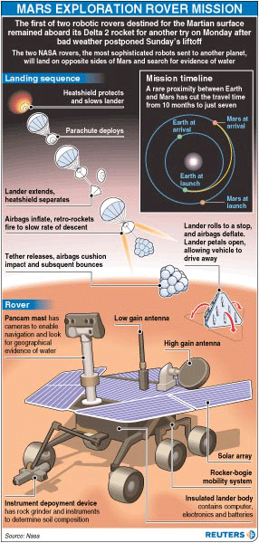 The second, MER-B, dubbed Opportunity, is scheduled to launch on June 25 and to land on January 25, 2004 in an area of Mars known as the Meridiani Planum.
