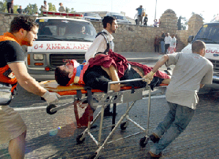 The cycle of bloodletting escalated Wednesday as a Palestinian blew himself up on a Jerusalem bus and killed 16 other people, and Israel retaliated with rocket attacks that left nine dead in Gaza, including two Hamas militants. President Bush called on all nations to cut off funds to terrorists like Hamas.