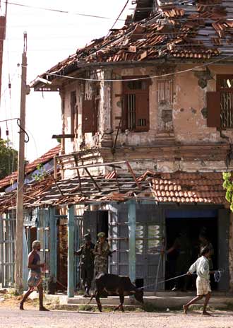 Residents of Sri Lanka's Jaffna peninsula walk by a shelled-out building housing soldiers in Chavakachcheri on July 17, 2003. Jaffna has been at the centre of the island's ethnic violence and residents are worried that a suspension in peace talks may mean a return to war. [Reuters]