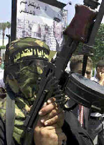 A Palestinian Islamic Jihad militant holds his rifle as he walks past a picture of Palestinian leader Yasser Arafat during the funerals of Faker el-Zaaneen, Mohammed Abo Hamdan, Kaldon el-Shompate and Roshdi el-Zaneen, in Gaza city, Monday June 23, 2003. [Reuters]