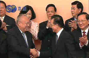 (L) shakes hands with Premier Wen Jiabao (R) at the Hong Kong