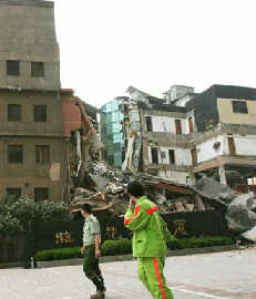 Two police officers pass the wreckage of a collapsed six-storey office building on the construction site of a metro line in Shanghai on July 1, 2003.  [newsphoto.com.cn]