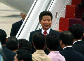 South Korean President Roh Moo-hyun, center, looks at a welcoming party on arrival at the Beijing international airport, China, Monday, July 7, 2003.[AP]