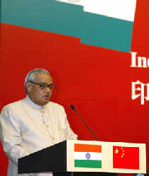 Visiting Indian Prime Minister Atal Behari Vajpayee delivers a speech at a seminar entitled "India & China, Challenges & Opportunities in the IT Sector" in Shanghai June 26, 2003. India's relationship with China has been transformed by a determination to cooperate and deal with problems, Vajpayee said. [Reuters]