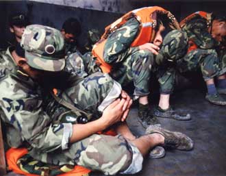 Tired soldiers take a rest. [newsphoto.com.cn]