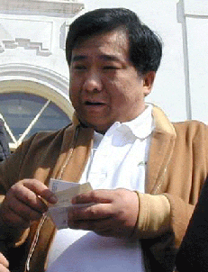 Chinese-born Dutch flower magnate Yang Bin talks to journalists on the steps of his Euro-Asia Group offices in the northeastern Chinese city of Shenyang in this October 3, 2002 file photo.