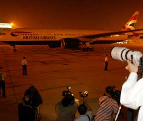 Reporters are prepared as Blair's plane touches down at the Beijing Capital International Airport. [newsphoto.com.cn]
