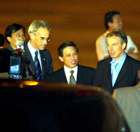 Vice-Foreign Minister Zhang Yasui (middle) meets Blair (right) at the airport. [newsphoto.com.cn]