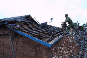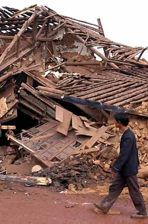 A man walks past a collapsed house following an earthquake measuring 6.2 on the Richter scale in Dayao County, southwest China's Yunnan Province, Tuesday, July 22, 2003. The quake has so far left 15 people dead and 294 others injured, China's Ministry of Civil Affairs said on Tuesday. [Xinhua]