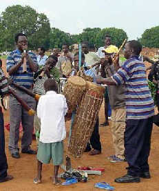 Sponsored by UNICEF, aid workers and local leaders, it makes a joyful break from 20 years of war and related famine that have left more than 2 million Sudanese dead. "You will find here Jor, Dinka, Balanda, Bongo, Chad, Kiraish and Arabs. Any tribe, you have them here," said Luis Carlos, a 27-year-old Jor who works occasionally as a vendor at the Wau market and rarely misses a peace dance. "I think it helps bring us together as tribes. It is good for us." Civil war broke out in 1983 when rebels seeking greater autonomy took up arms against Sudan's predominantly Arab and Muslim government. In the Wau region of the largely animist and Christian south, tribesmen allied themselves with rival rebel groups, and some estimates say more people died in the southern clashes than in the whole north-south war. Anthony Obur Donyia, a Fertit leader and peace dance organizer, says the tribes slowly came to see themselves as pawns in other people's wars. "When we realized that this is not our own making, we said we should stop this among us, enough is enough. And we thought of something that brings us together, something common, and this is dancing." There's the male-dominated dance of the Dinka in which participants brandish fake spears and mimic a bull's horns with their hands. And there's a gentler, more feminine Fertit dance in which women and men imitate the strutting of courting pigeons. All are driven by the beat of tambourines made of hide. Some tribes add bells or wind instruments fashioned from animal horns or bamboo. The dancers gather every Sunday ¡ª some in shorts or trousers, others in tribal dress. Up to 1,000 people from a dozen tribes turn out on a good day. If it rains, the event moves to another day. But no week goes by without a peace dance. The setting itself is a reminder of the fighting. Many of the homes and businesses surrounding the square have been destroyed by shelling. Each tribe gathers in its own circle as the evening begins. Then a young man or woman visits another tribe's circle to dance and learn. The dancing continues until sunset, after which some young people linger to chat. The curfew has been extended four hours to 10 p.m. thanks to easing tensions. "Now you can see we can dance together and learn from each other," Donyia said. "People continue to dance whatever happens, and there was never a case of quarreling or fighting." Events, though, can darken the mood. When the latest session of peace talks in Nairobi, Kenya, ended in stalemate, people on their way to the dance gathered in small groups to mull over the bad news. No date for resuming peace talks has been set. But the dancing continues.