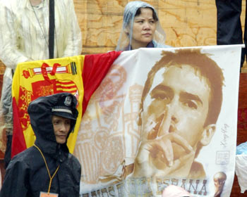 | | Chinese soccer fan holds a poster of Real Madrid's midfielder Raul next to a policeman (L) as they watch Real Madrid during a morning training session at Hongta Sports Centre in Kunming, the capital of China's southwestern province of Yunnan, July 27, 2003. Real Madrid, with newly added icon David Beckham, are on a two-week Asian tour including Japan and Hong Kong.[Reuters] |
