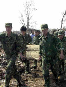 Soldiers of the People's Liberation Army clean up the site of an explosion in
