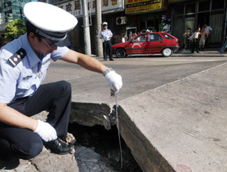 A policeman measures the extent