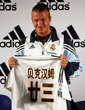 | | Real Madrid's midfielder David Beckham holds a jersey with his name in Chinese characters during a news conference in Kunming, the capital of China's southwestern province of Yunnan, July 30, 2003. Real Madrid, with newly added icon David Beckham, are on a two-week Asian tour including Japan and Hong Kong. |