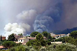 Vacation homes are threatened by approaching forest fires near La Bouverie in southern France.The intense heat wave that has baked much of Europe for weeks, fueling deadly forest fires, causing drought and damaging crops, has convinced many people that global warming is a reality. While experts caution that you cannot read too much into a single hot summer or natural disaster, Europe does seem to be experiencing extreme weather with growing frequency. [Reuters]