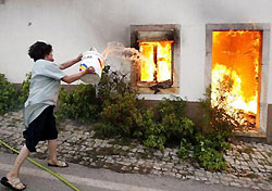 A woman uses a bucket to fight a fire in a house in the village of Torre, central Portugal, Aug. 2, 2003, after a forest fire reached the village and burnt down six houses. On Aug. 3 2003, dozens of wildfires are still raging across Portugal fuelled by the dry hot weather conditions. [AP]
