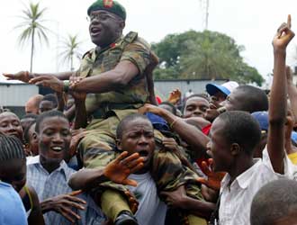 helicopter on Monday, as war-weary Liberians danced for joy in ruined