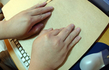 Guo Quan reads the contents of the computer screen with the help of adaptive technology that prints out the text in Braille.[China Daily]