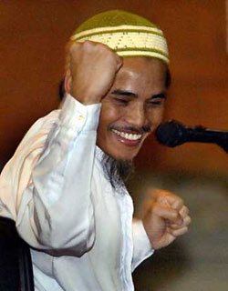 Amien Rais, a top presidential contender for next year's elections and a key Muslim leader, said those convicted of terror crimes should not be allowed to appeal and that separate courts should handle such crimes to speed up the process. "I say with all seriousness that every terrorist who is proven to have carried out crimes against humanity immediately be given the punishment they deserve. That is better than a prolonged legal process," Rais told reporters late on Thursday. An aide explained that the politician believed that if evidence was strong at the first trial then sentencing on those convicted as terrorists should be implemented without delay. Choirul, a cigarette seller on a Jakarta street, reflected the horror at the attacks expressed by many moderate faithful in the world's most populous Muslim nation. "Many victims of Bali died slowly, Amrozi should die slowly as well, rather than being shot. He should be cut to pieces," he said. Nearly half those killed in Bali were Australians. The verdict came just two days after a car bomb killed 10 people at a luxury hotel in Jakarta and coincided with concern that a shadowy Southeast Asian network linked to al Qaeda -- Jemaah Islamiah -- might be plotting further strikes. Lawyers for Amrozi, 40, have said they would appeal. After the sentence was announced, Amrozi swiveled his chair to the courtroom to face victims of those killed, smiled broadly and made a thumbs-up sign with both hands. That picture was plastered across newspapers on Friday. The English-language Jakarta Post described the ruling as "a new milestone in the country's history of jurisprudence." It said the verdict was important for the world's most populous Muslim nation, coming so soon after the Marriott attack. "Indonesians will understand the extreme verdict that was passed by the court. It is obvious that the government, including the judicial authorities, cannot bow to such threats," it said. But the leading Tempo newspaper warned that repressive action might not succeed in the war on terror. "Amrozi's two thumbs up shows we will never run out of militant people who are willing to become martyrs," it said in an editorial. In Bali, three Australian men from Darwin, dressed in singlets, shorts and flipflops gazed at the fence outside a mound of gravel and weeds that used to be the popular Sari club, which took the brunt of a huge car bomb attack last October. Asked how they felt when Amrozi gave the thumbs up, one of them, Tony Challen, said: "He's an arrogant bastard. He's a dog and should be treated like one. Shooting is too quick." Sitting on a rattan mat on Bali's famous Kuta beach drinking tea, Made Putra Yasa, said he felt relieved. "I feel happy becaused he must die. If he lives he will make more bombs," said the 22-year-old waiter. Amrozi was the first of three dozen suspects to be tried for the world's worst terror act since the September 2001 attacks. He admitted bringing a minivan to Bali so it could be turned into a huge car bomb. Like other accused Bali bombers, Amrozi came under the sway of the teachings of Abu Bakar Bashir, alleged head of Jemaah Islamiah. Police have linked Bashir to the Bali blasts but not named him as a suspect. The cleric has denied wrongdoing.