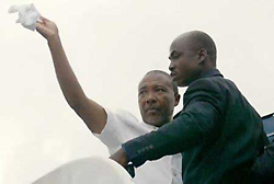 At the top, the 54-year-old Taylor turned and raised a white handkerchief to wave at the crowd. Security forces brusquely hustled him inside before he completed the gesture.