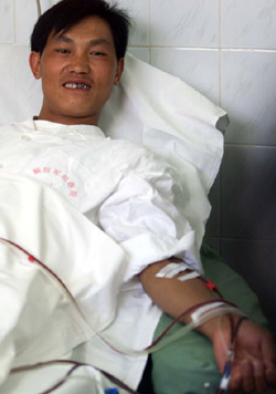 Yesterday morning, doctors with the army's Hospital No 301 spent three hours extracting 100 millimetres of peripheral blood stem cells from the donor. The cells were transplanted in the afternoon at the army's Hospital No 307. Both the patient and the donor were doing well last night. Another 100 millimetres of blood stem cells will be transplanted today. The 20-year-old patient Chen Bo, a student at the Shanghai Institute of Foreign Trade, was last year diagnosed with chronic myeloid leukaemia, an illness that deprived him of the ability to generate new blood. "The only way to save Chen's life is allogenous transplant (from a donor)," said Chen Hu, an expert with the army's Hospital No 307. "It requires a healthy person whose blood cells match Chen's to donate 200 millilitres of blood stem cells." A suitable donor was found in June after the donor information organization carried out a nationwide search for a blood match. The donor is Hu Yugao, a peasant-turned-migrant worker from Southwest China's Yunnan Province. He happened to be passing a mobile blood-donation van in East China's Zhejiang Province and was offered information about his blood. After a health check, he signed an agreement last Thursday to say he would donate the stem cells. Hu smiled calmly at the operating table yesterday even though he was tired after undergoing four days of injections to get the stem cells to move into his peripheral blood. Thanks to scientific advances, donating stem cells, like donating blood, does not harm the donor, said Shen Dehuang, an official with the donor information group. After 100 millimetres of blood stem cells was collected yesterday, Hu's blood flowed back into his body through special medical instruments.