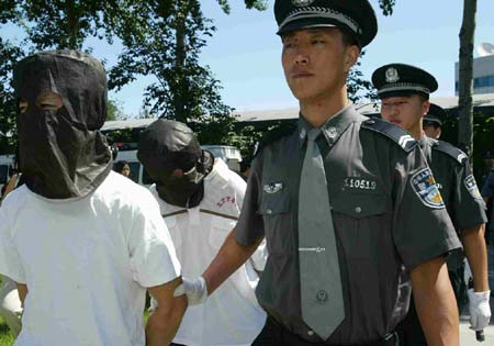 Wearing disposable masks, two criminals suspects are escorted to a courtroom by police in Beijing. The mask assure the suspects won't be identified before the court make a final judgement.The city's No 1 Intermediate People's Court has taken new measures to protect the legal rights of the accused. [China Daily]
