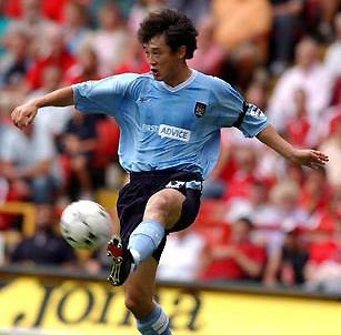 Sun Jihai controls the ball in a Premiership match where Manchester City beat Charlton 3-0 in London, August 17, 2003. Sun scored the third goal for Man City at the 86th minute. [photocom]