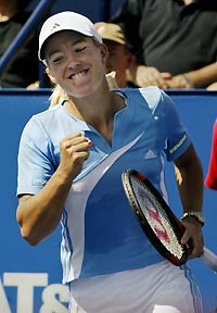 Clijsters was beaten by Krasnoroutskaya on Thursday when the tournament was delayed by the largest blackout to hit the northeastern United States and Canada. The Belgians are friendly rivals, with Henin-Hardenne hot in pursuit of Clijsters's number-one ranking. "For sure, being number one is the goal right now," Henin-Hardenne said. She broke serve in the opening game to set the tone, then held hers to go up 2-0. The 19-year-old Russian came to life in the third game, fighting back from triple break point to win. But second seed Henin-Hardenne was relentless, breaking serve in the fifth and seventh games to take the set in 25 minutes. With Krasnoroutskaya misfiring repeatedly, The Belgian broke in the second game of the second set. Game three, however, went to deuce six times with the Russian almost breaking back and finishing on Henin-Hardenne's ninth ace of the afternoon. "I was a little bit surprised at how well it went today," said the champion. "I didn't know what to expect. She was playing great tennis this week but I knew she would be a little bit tired and nervous in her first final. "I just tried to forget about these things and prepare the best way that I could." Krasnoroutskaya, in her first WTA final, said that she did not match up to Henin-Hardenne. "It was really hard for me to play against Justine," she said. "She has a style of tennis that I don't like to play against, lots of top spin, and she keeps you back all the time. "I'm a little bit disappointed because the week could have ended a little bit better. But I can't change anything that happened and I will live with it," the Russian added. Henin-Hardenne now heads for the US Open, where she is among the favourites. Her previous wins this year were at the Dubai Open, Family Circle Cup, German Open, French Open -- her first grand slam -- and Acura Classic. Crowd favourite Martina Navratilova and Svetlena Kuznetsova defeated Maria Vento-Kabchi and Angelique Widjaja 3-6, 6-1 6-1 in the doubles final. It was Navratilova's seventh Canadian title, three of them in singles. American Andy Roddick secured back-to-back Masters Series titles with a thrilling 4-6 7-6 7-6 victory over friend and compatriot Mardy Fish in the $2.45 million Cincinnati final on Sunday. Seventh seed Roddick, the most prolific player of the north American hardcourt season, saved two match points before prevailing in the deciding set tiebreak 7-4.