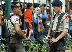 Policemen stand guard in front of the presidential palace during Indonesia's Independence Day in Jakarta, August 17, 2003. Indonesian security forces went onto their highest alert level, following this month's bombing of a luxury Jakarta hotel and warnings that more attacks may be planned. [Reuters]