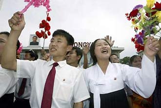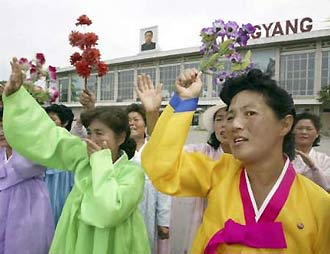 North Koreans bid farewell to South Koreans at Sunahn Airport in North Korea 's capital Pyongyang, August 17, 2003. [Reuters]