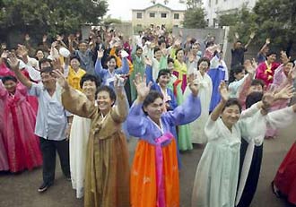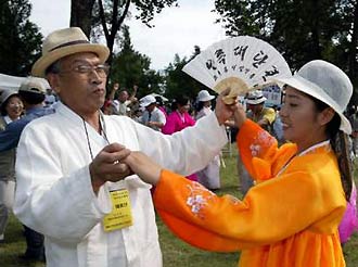 A North Korean woman (R) dances with a South Korean man during a unification rally in Pyongyang, August 15, 2003.  [Reuters]