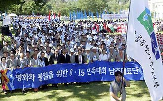 South Koreans march with banners reading: 'Aug. 15 Rally For Peace and Reunification' during a joint rally with North Koreans, Aug. 15, 2003 in Pyongyang. [AP]