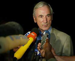 German Deputy Foreign Minister Juergen Chrobog announces to reporters at Bamako airport the release of the hostages, from the north of the country, August 18, 2003. 14 European hostages, held by Algerian militants in the Sahara desert for over five months and handed over to Malian authorities, are expected to travel to the capital Bamako on Tuesday, the minister said.  [Reuters]