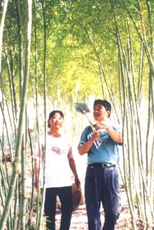 Zhang Wenting and her husband Du Xusheng take a stroll in the woods they've worked for eight years to creat. [China Daily]