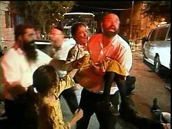 Rescue workers carry an injured boy on a Jerusalem street Tuesday night, Aug. 19, 2003 after a suicide bomber blew himself up on a packed bus, Nobody immediately claimed responsibility. [AP]