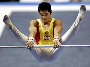 | Chinese gymnasts Huang Xu (front) and Teng