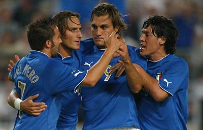 Sure enough, it was a tightly coordinated passing movement between del Piero and Totti running rings around the German back four which put Vieri through to hammer home from just inside the box in the 17th minute. Totti and Vieri combined again in the 23rd minute but Danish referee Kim Milton Nielsen said the goal by del Piero was offside. The Germans, missing eight key players, including midfield creative forces Michael Ballack and Sebastian Deisler, had a weak first half and found it difficult to hold on to the ball. ALWAYS BITTER However, they were transformed in the second half with better organisation at the back after Hertha Berlin's Marko Rehmer was brought on for Christian Woerns and Dortmund's Sebastian Kehl came on for Carsten Ramelow. "It's always bitter to lose an international at home. We played well in the second half but we didn't make the most of our chances," said German coach Rudi Voeller, who played for Roma between 1987 and 1992 and has an Italian wife. "You must remember Italy are a world-class team. You can never fully shut down players like Del Piero, Totti or Vieri." The German midfield piled on the pressure in the second half, ensuring a busy night for Juventus's Gianluigi Buffon. Italian trainer Giovanni Trapattoni said Germany probably deserved a draw based on their second-half performance. "In the second half we ran out of steam a bit as we're not in top form yet because the season doesn't start until September," he said. There was controversy in the run-up to the game because of suggestions by Oliver Kahn that many of the German team lacked sufficient commitment to the national side, pleading "injured left toes" instead of choosing to take part in a friendly. With six World Cups between them, pride was the main thing at stake in the clash, but Voeller was aware that his side's easy run to the final of the World Cup in 2002 masked a major dip in form for the three-time world champions. Defeat means Germany have not beaten a top international side since October 2000 when they beat England 1-0 at Wembley. Germany top Group Five on 11 points and next travel to Iceland in European Championship qualifying on September 6 before hosting Scotland four days later. Italy are second in Group Nine but can go top if they beat leaders Wales, who lost on Wednesday to Serbia and Montenegro, on September 6 at home. They then travel to Serbia and Montenegro four days later.