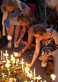 Three women set down candles at a vigil for the victims of the bombing of U.N. headquarters in Iraq, near the United Nations in New York, August 20, 2003.   [Reuters]