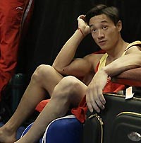 Yang Wei sits dejected after losing gold in men's all-around. [Reuters]