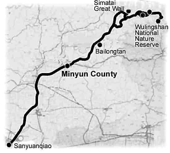 Travel tips: It is very cool in summer, so thick long-sleeve clothes are a must. A ticket costs 70 yuan (US$8.47). How to get there (with map): Take a long-distance bus to Miyun from Dongzhimen Bus Terminal. At Miyun change to the Wuling Mountains National Forest Park bus. By car: drive along the Beijing-Chengde Highway directly to Miyun, turn right at Songshuyu, turn onto Caojia Road and continue for about 2 kilometres. Telephone: 010-81022403