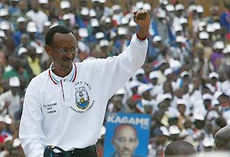 Rwandan incumbent President Paul Kagame, leader of the Rwandan Patriotic Front (RPF) salutes a crowd of supporters, Saturday, Aug 23, 2003 during the last day of campaigning at the Stage Regional de Kigali stadium in the Rwandan capital, Kigali. Rwanda will hold its first Presidential elections since the 1994 genocide on Aug 25.Kagame wins Rwanda Presidential polls in landslide on Thursday, Aug 26,2003.  [AP]